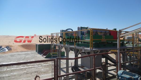 From below picture, we can see GN’s centrifuge was located on steel frame as 2 units in one group. In a drilling fluids solids control system, this layout helps the centrifuge perform to different purpose. In the group, one centrifuge is equipped with low speed pulley, which is used for barite recovery. The liquid effluence from the low speed centrifuge will be transferred to the high speed centrifuge for low SG (Specific Gravity) solids removal from the drilling mud. With a high location, the treated active mud would flow back to the solids control system under the Gravity force. GN’s centrifuges are also widely used in waste cuttings management system.